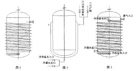 該廠大部分“U”夾套結(jié)構(gòu)反應(yīng)釜為常壓操作,而“U”型夾套內(nèi)常通 人0.3MPa-0.6MPa的蒸汽加熱,按《壓力容器安全技術(shù)監(jiān)察規(guī)程》劃分, 為類(D1級)壓力容器。有些反應(yīng)釜內(nèi)是冷~熱間隔操作的,有時夾 套會出現(xiàn)使用冷凍鹽水降溫后再通入蒸汽的工況,這樣一旦誤操作會發(fā)生冷凍鹽水流失,造成浪費(見圖2)。采用雙螺旋半圓管夾套,使冷凍鹽水和蒸汽各行其道,可以徹底杜絕傳熱介質(zhì)摻混和流失的問題(見 圖3)。鑒于以上原因,我們對該廠的這一類型設(shè)備進行了更新和改造, 設(shè)計了半圓管夾套來代替“U”型夾套。